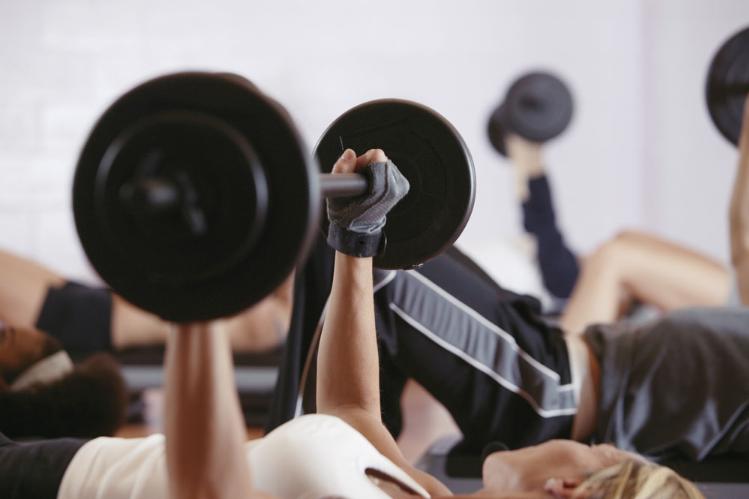 啞鈴練習(xí)需要比杠鈴練習(xí)更多的平衡和協(xié)調(diào)能力來(lái)控制重量,其動(dòng)作幅度較大,因此可以充分伸展肌肉,練就寬廣胸懷。通常的訓(xùn)練動(dòng)作有兩種,平板啞鈴臥推和平板啞鈴飛鳥(niǎo)。前者就是平躺在訓(xùn)練凳上,雙手各持啞鈴。伸直雙臂,將啞鈴舉起,手心相對(duì),慢速下放啞鈴直到上臂與地面平行為止,然后推起啞鈴回到起始姿勢(shì),如此重復(fù)。而所謂啞鈴飛鳥(niǎo)就是平躺在訓(xùn)練凳上,雙手各持啞鈴上舉,手心相對(duì),打開(kāi)雙臂,沿圓弧軌跡向身體兩側(cè)慢速下放啞鈴,直到上臂與地面平行為止,然后原路返回。兩組運(yùn)動(dòng)都要注意在上推的過(guò)程中,確保豎直地推起啞鈴,不要偏斜。提醒初學(xué)者最好請(qǐng)人在一旁保護(hù),避免動(dòng)作不協(xié)調(diào)時(shí)損傷肌肉。啞鈴練習(xí)還有一個(gè)好處,就是可以隨時(shí)隨地可以進(jìn)行,建議平常在家也可對(duì)著鏡子練習(xí),一邊可以糾正動(dòng)作,一邊可以欣賞自己的鍛煉成果。 杠鈴———胸肌厚度