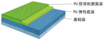 聚氨酯塑膠也稱PU,這種材質多用于大型田徑跑道上和籃球場地面層。是一種現(xiàn)場澆鋪刮板制做的材質,有分色一次性鋪成做法和先鋪底膠再做含砂噴涂的兩層做法這種材質合成后,由于具有一定的韌性,很適于鋪在屋頂上和有裂紋的基礎地面上,而且有彈性、質感好,雨后20~30分鐘可恢復使用,無需經常保養(yǎng),合格產品環(huán)保.
