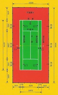 國際網(wǎng)聯(lián)和國家體委頒布的《網(wǎng)球競賽規(guī)則》中規(guī)定,一片標(biāo)準(zhǔn)網(wǎng)球場地的占地面積不小于36.58米(長)×18.29米(寬),這個尺寸也是一片標(biāo)準(zhǔn)網(wǎng)球場地四周圍擋網(wǎng)或室內(nèi)建筑內(nèi)墻面的凈尺寸。在這個面積內(nèi),有效雙打場地的標(biāo)準(zhǔn)尺寸是:23.77米(長)×10.97米(寬),在每條端線后應(yīng)留有不小于3.66米的空地。在球場安裝網(wǎng)柱,兩柱中心測量,柱間距離是12.80米。網(wǎng)柱頂端距地平面是1.07米,球網(wǎng)中心上沿距地平面是0.914米。