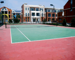 這是一種現(xiàn)場澆鋪用刮板制作在瀝青混凝土上或鋼盤混凝土結(jié)構(gòu)地面上的新型材,其工藝主要分為找平結(jié)合層、加強(qiáng)層、耐磨層等多層做法,還有含膠粒的多層做法這種面層材料及工藝的優(yōu)點(diǎn)是平整度高、表面硬度高、耐磨、抗曬、色澤鮮艷、使用壽命長便于管理和維修。這種面層材質(zhì)穩(wěn)定的網(wǎng)球場近年來已開始在世界各地普遍采用,管它球速稍快,較之其它類型球場,球的彈跳平衡,球員場上跑動舒服,是一種既可供娛樂打球也可用做正規(guī)比賽的高檔次網(wǎng)球場地